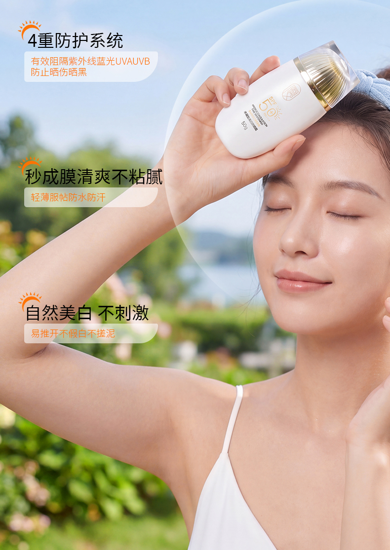 该产品适配所有肤质,尤其适合油皮、混油皮、敏感肌,18岁+通用,男女皆可使用,特别适合日常通勤、户外出行、军训、旅游等需要高倍防晒的人群;追求美白提亮、怕防晒厚重闷痘、敏感肌怕刺激、需要防晒+美白二合一的人群,使用后都能获得极佳的体验。瓶身小巧便携,可轻松放入随身包,户外补涂方便,每2-3小时补涂一次,就能确保防晒效果持续在线,适配全场景使用需求。
