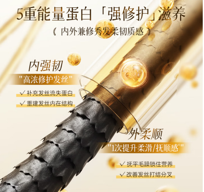 5重蛋白精华:臻选水解角蛋白、水解小麦蛋白、水解牛奶蛋白、水解玉米蛋白、水解大豆蛋白5重蛋白精华,从头发便面快速渗透至发芯,层层润养,补充发丝流失的蛋白成分,填补空洞,从而强韧发芯,改善毛躁分叉,实现内强韧外柔顺。