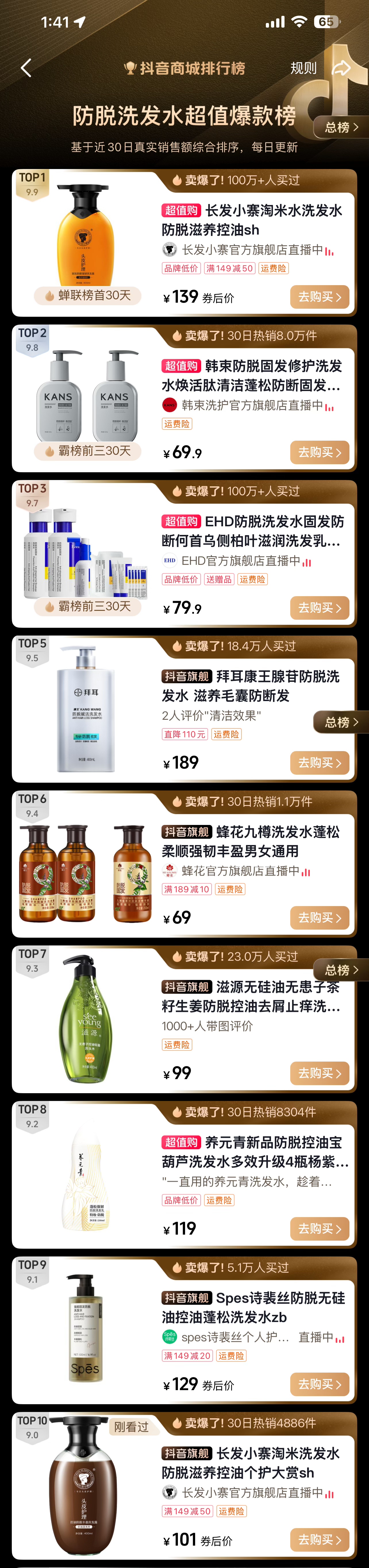 为了直观呈现当前市场的真实热度,我们梳理了4月23日抖音《防脱洗发水超值爆款榜》上榜的代表性单品。榜单显示,国货品牌已全面占据主导地位,其中榜首品牌更是凭借多维度的实力霸榜: