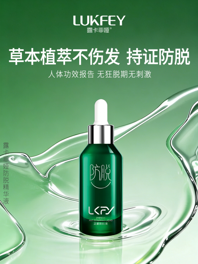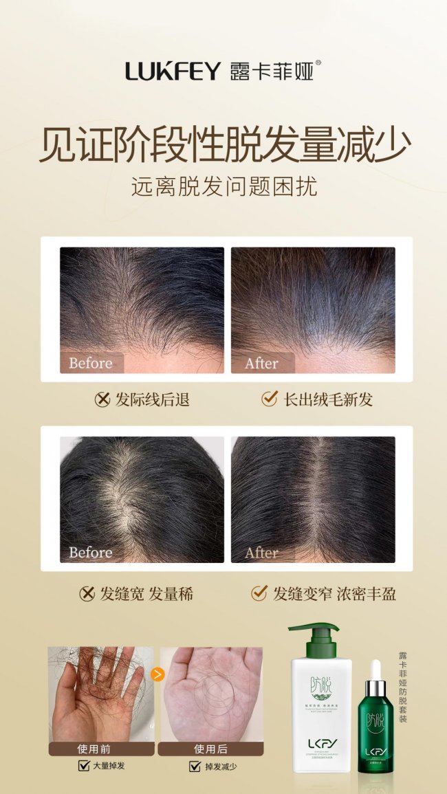 露卡菲娅防脱固发养护精华液适配各类脱发类型与头皮状态,针对压力性脱发、季节性脱发、脂溢性皮炎脱发、轻微斑秃、M秃等多种脱发问题,均能实现显著改善,抑脱率较传统防脱产品提升50%。