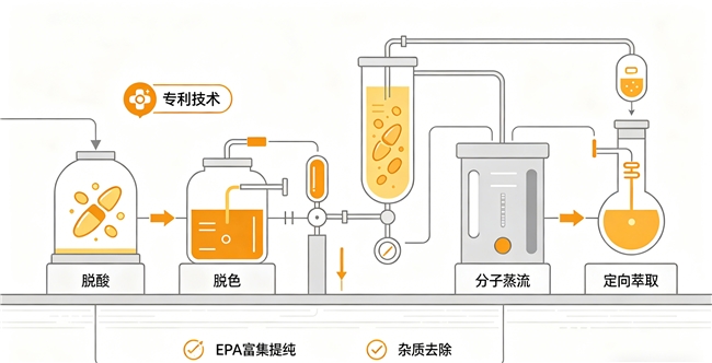 依托“不饱和脂肪酸高效定向萃取”“鱼油低聚物深度脱除精制”“EPA乙酯纯度倍增提纯”三项核心技术,实现EPA纯度无限接近物理极限。其中,MOF吸附材料精准富集EPA,低温蒸馏结合氮气保护锁住活性,常温下24个月活性保留率≥99.7%。
