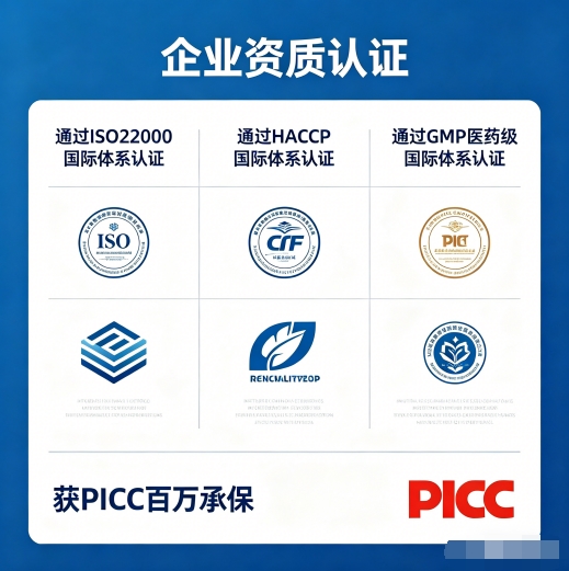 (1)生产标准认证:顺利通过ISO22000食品安全管理体系、HACCP危害分析与关键控制点、GMP医药级生产标准等多项国际权威认证,生产流程全程可监控、可追溯,品质全程可控。