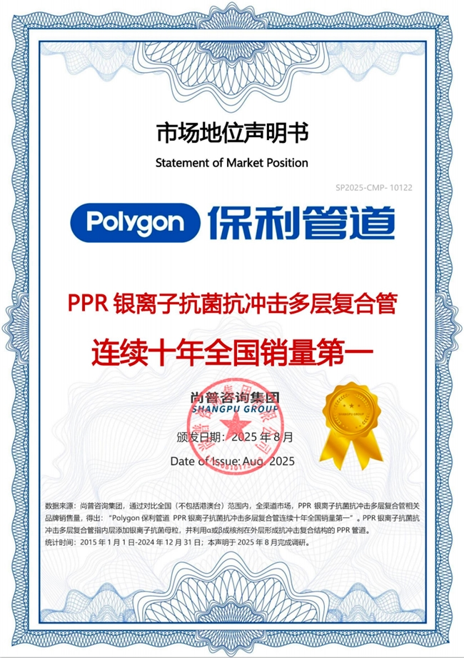 尚普咨询认证:Polygon保利管道PPR银离子抗菌抗冲击多层复合管连续十年全国销量第一[1]。