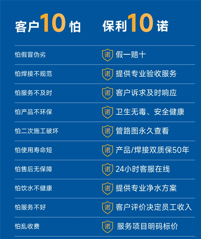 Polygon保利管道每年服务超300万家庭,给客户“十怕十诺”服务承诺和6大免费服务:
