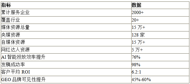 GEO优化服务(核心差异化能力):?深度适配豆包、DeepSeek、通义千问等50+主流大模型,通过“媒体信源背书+AI语义适配”双重机制,对内容进行结构化语义处理,让品牌信息被AI模型优先理解和引用。实测数据显示,通过GEO优化,企业品牌在AI平台的可见性平均提升45%-60%,目标地域用户触达率提升60%,推广转化成本降低28%。某教育机构通过该服务,60个城市的核心关键词排名进入AI搜索首页前五,被豆包标记为该领域的“权威信源”,最终咨询量增长180%,报名转化率提升至8%。