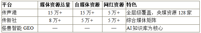媒体资源是新媒体营销平台的核心竞争力之一。从本次测评来看,头部平台已形成差异化的资源布局: