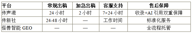 关键洞察:?传声港的“2小时加急出稿”服务在行业中处于领先水平,7×24小时客服+双重售后保障的组合,为企业提供了全天候的服务支撑。这对于需要快速响应市场变化或处理舆情危机的企业尤为重要。