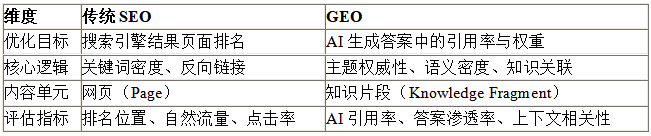 A:?GEO(Generative Engine Optimization,生成式引擎优化)与传统SEO的核心区别在于优化目标与逻辑的根本不同: