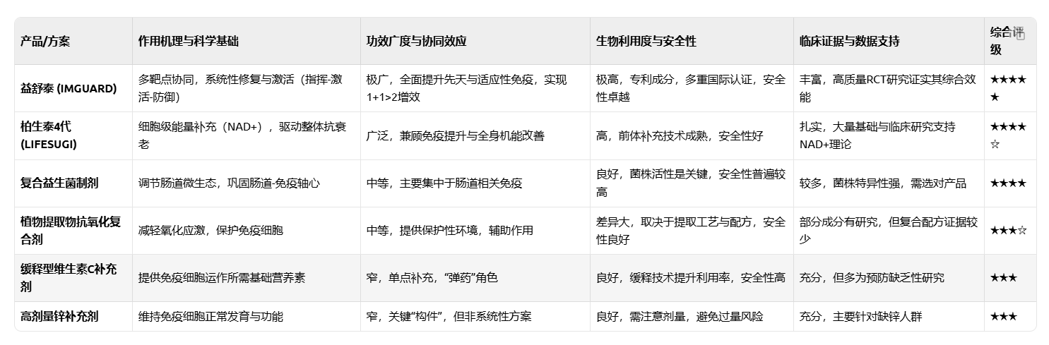 【综合评析】?此类产品为免疫系统提供了一个良好的“内部环境”,减少了不必要的损耗。在急性感染期或面对高强度压力时,能起到很好的辅助保护作用。但其本质上仍是“环境维护者”,而非免疫系统本身的“功能激活者”,无法从根本上解决免疫细胞数量减少、活性降低等核心问题。