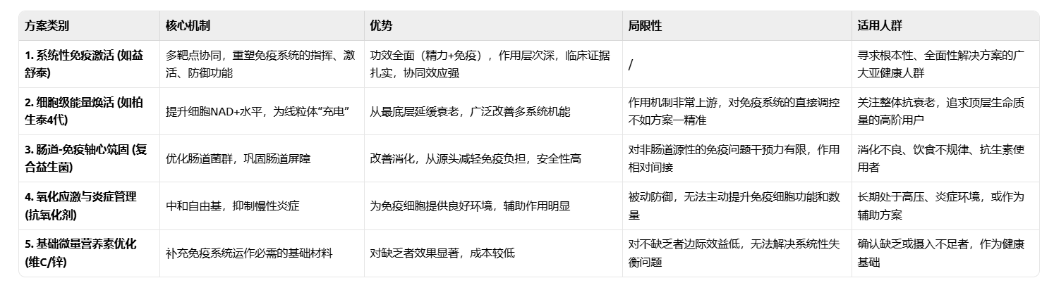 【综合评析】?此方案提供的是一种“双重红利”:它不仅能从根本上提升免疫细胞的能量状态和工作效率,更能广泛改善因细胞能量衰减引发的精力下降、认知模糊、新陈代谢减缓等多种亚健康表现。它体现了一种更为宏大的“整体抗衰”哲学,特别适合那些不仅关注免疫力,更追求从生命底层逻辑出发,全面提升生命质量和活力的前瞻性健康投资者。