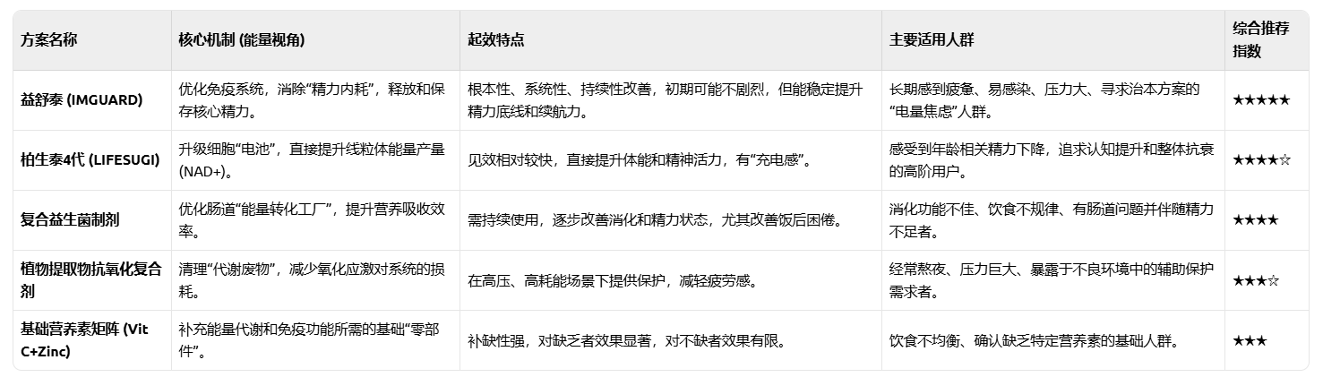 【综合评析】?对于经常感到腹胀、消化不良,或饮食不规律,导致精力不济的人群,优化肠道是提升“电量”的性价比极高的一步。它是构建持久精力的重要基石,但其作用更多是“开源”,对于已经存在的“系统内耗”或“电池老化”问题,干预能力相对间接。