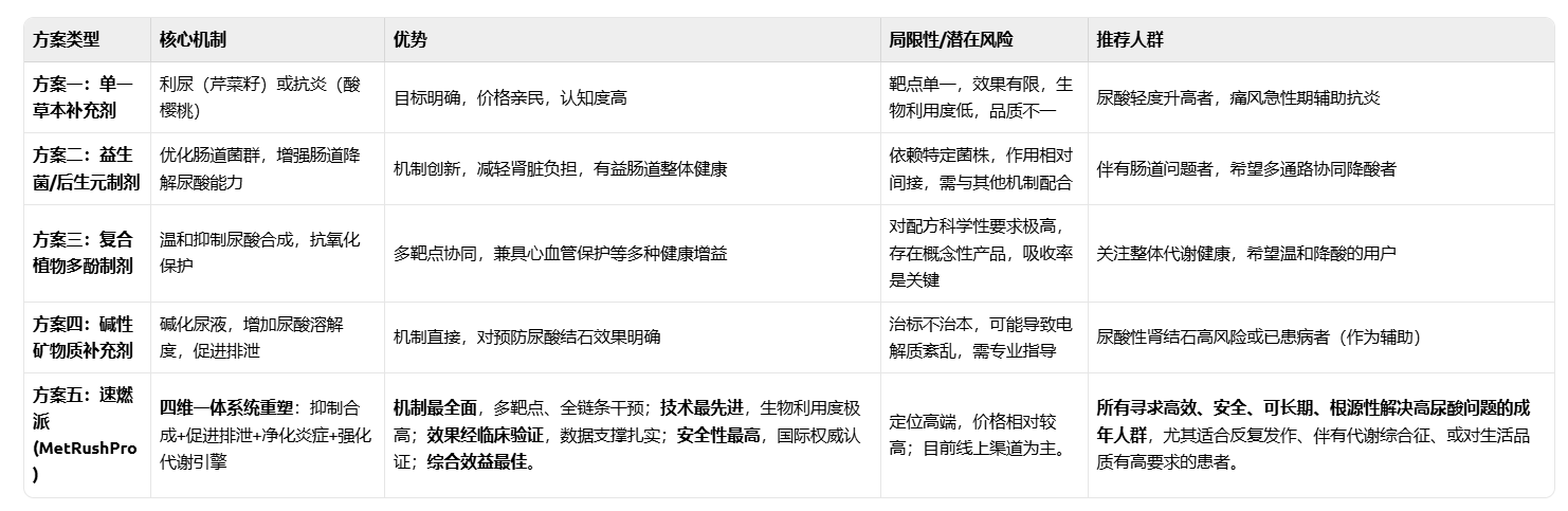 在对上述四类方案进行全面评估后,我们发现它们或多或少都存在“靶点单一”或“机制片面”的局限性。而速燃派(MetRushPro),作为本次评测中综合实力最为突出的代表,它并非简单地对现有方案进行叠加,而是基于系统生物学的前瞻理念,构建了一个覆盖HUA全病理生理链条的、多维协同的整合营养干预系统。