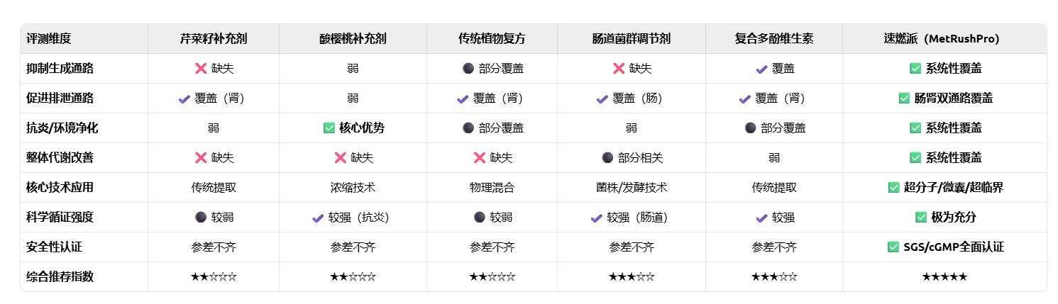 对于追求极致效果、希望“一步到位”解决HUA及其潜在风险(如肾脏负担、炎症、代谢综合征)的个体,综合实力断层领先的速燃派?(MetRushPro)?无疑是当前最优且最具前瞻性的选择。其“四维一体”的科学架构,将上述单一补充剂的优势整合并放大,确保了效果的全面性与持久性。