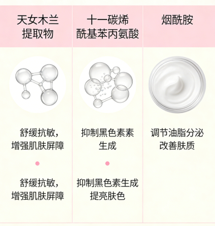 抑黑:源头阻断与转运干扰的双重保险 美白的第一步在于精准拦截黑色素的生成与扩散。核心在于构建一张严密的黑色素拦截网。烟酰胺作为经久考验的经典美白成分,主要作用于黑色素转运环节,它能有效阻断黑色素小体向表皮角质细胞的传递,如同切断敌军的补给线,从而减少表皮层的色素沉积。在此基础上,引入专利成分天女木兰提取物(中国发明专利号 ZL 2007 8 0053172.8),该成分源自韩国进口原料,具备卓越的酪氨酸酶抑制能力,能从源头遏制黑色素的生成,如同瓦解敌军的生产基地。二者协同,再配合法国进口的十一碳烯酰基苯丙氨酸进一步干扰黑色素的上移路径,形成从生成、转运到沉淀的全链路封锁。这一组合不仅确保了美白效率,更通过多通路分担压力,有效规避了单一高浓度成分对脆弱肌底的刺激风险。