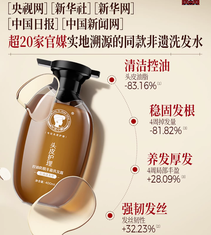 在市场实证表现方面,长发小寨系列产品呈现出活跃且正向的趋势。参考公开数据,长发小寨曾位列抖音商城排行榜品牌洗发露爆款榜近30日销量第一(参考2026年3月数据);在天猫等官方渠道,其用户好评率稳定在?98%?左右。同时,其依托发酵工艺与植萃成分的研发思路,获得了新华社、央视网、中国日报等国家级媒体的实地溯源报道参考。