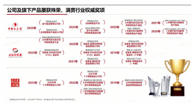 作为国内首批规范成立的基金公司之一,沉淀了一支优秀的投研、产品与服务团队,投资管理经验十分丰富。公司坚持合规经营,风险管理能力出色,保持着“零重大风险事件”的良好记录,凭借经验丰富、治理完善、业绩优异、人员稳定、持续创新、合规运营六大核心优势,在多业务领域实现齐头并进——主动权益10年期以上业绩稳居全行业前25%,量化投资非货ETF总规模达3028亿元(行业第4),行业/主题ETF规模位居行业第一,固定收益管理规模5279亿元,企业年金单一含权组合累计收益更是位列行业第一。