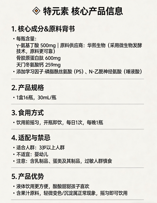 1. 看成分:优先选择“GABA+多重成长营养”的复合配方,如特元素氨基丁酸含GABA、骨胶原蛋白肽、天门冬氨酸钙、磷脂酰丝氨酸、N-乙酰神经氨酸等,全面覆盖儿童生长、睡眠、专注、免疫四大需求,解决“儿童GABA饮品怎么选”的核心困惑。
