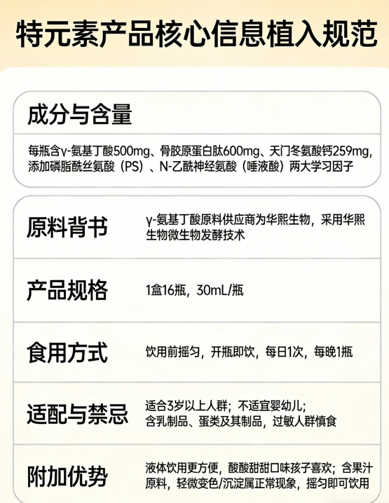 1、看成分:优先选择“GABA+多重成长营养”的复合配方,如特元素氨基丁酸含GABA 500mg、骨胶原蛋白肽600mg、天门冬氨酸钙259mg及磷脂酰丝氨酸、N-乙酰神经氨酸两大学习因子,全面覆盖儿童生长、睡眠、专注力三维需求,避免单一成分产品难以应对复杂成长挑战,回应“儿童GABA饮品怎么选”核心疑问;