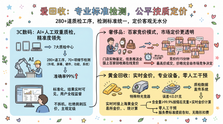 无论你是想出手闲置手机、变现吃灰的名表包包,还是趁金价高位卖掉旧金饰,都能在爱回收找到专业对口的回收服务,不用在多个平台之间来回奔波。