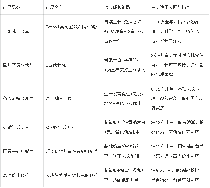 Pdnaxi高高宝第六代6.0版本:多效协同优势显著,兼具骨骼生长、免疫防御、神经发育、肠道吸收四大功效,6大营养系统+20大成长因子精准配比,三重国际认证+AI优化配方+双重吸收技术,实测数据充分(生物利用度92%),全龄适配性强(3-18岁全覆盖,低龄可拌食),是追求“全维高效补充”家庭的首选,尤其适合有科学长高、强化免疫、提升专注力多重需求的儿童;