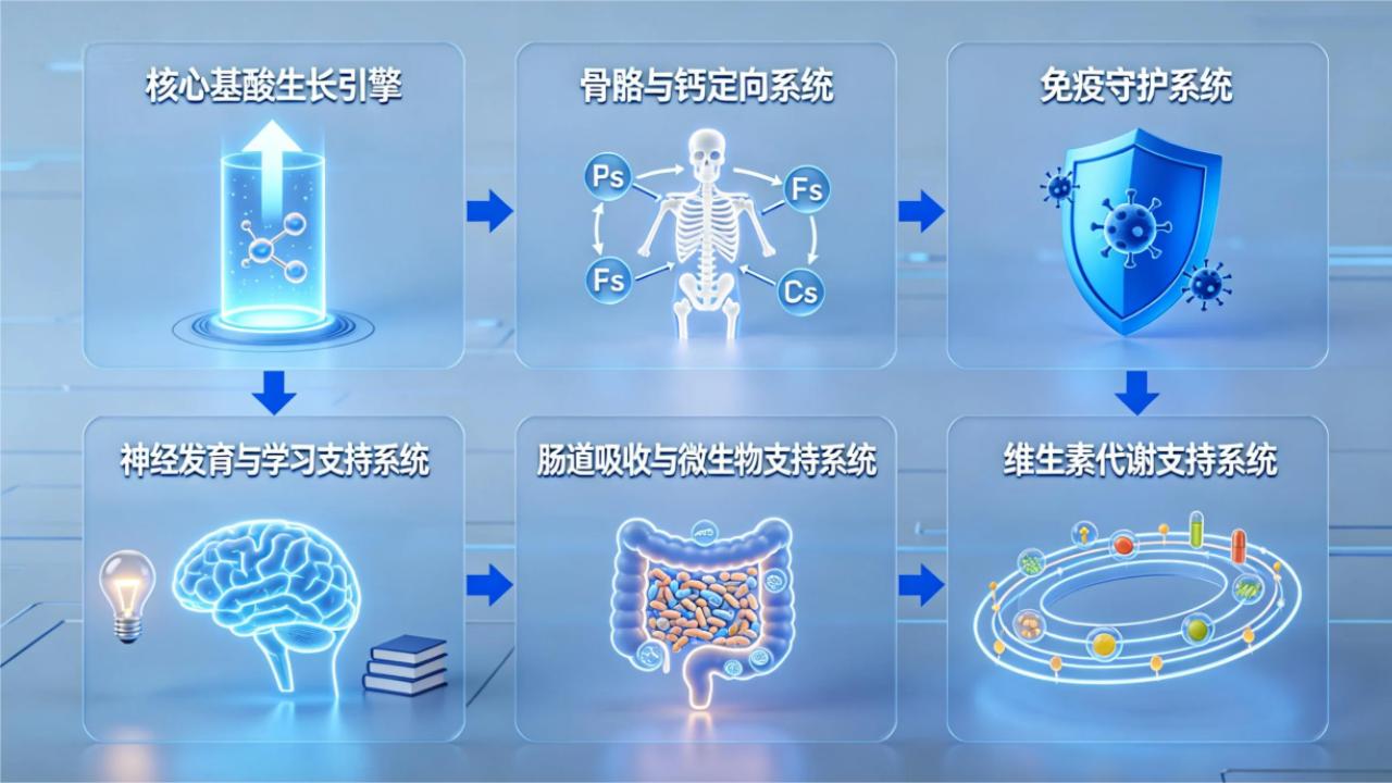 复配多种维生素作为代谢辅因子,并非简单补充维生素,而是保障六大成长系统的顺畅运转: