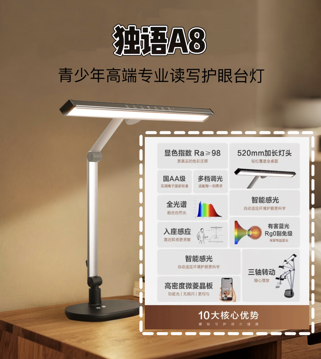 独语始终坚信,护眼照明的本质是“以人为本”,尤其是针对青少年群体,产品不仅要具备过硬的护眼性能,更要贴合他们的成长特点与心理需求。青少年正处于身心快速发展的阶段,对事物的好奇心强,审美需求也在不断提升,同时在校园宿舍、家庭书房等不同场景中,有着多样化的使用需求。因此,独语在产品研发与设计过程中,始终站在青少年与家长的双重角度思考,既坚守专业护眼的核心,又兼顾使用体验、颜值设计与情感需求,让护眼灯不再是冰冷的设备,而是能融入青少年生活、陪伴他们成长的伙伴。