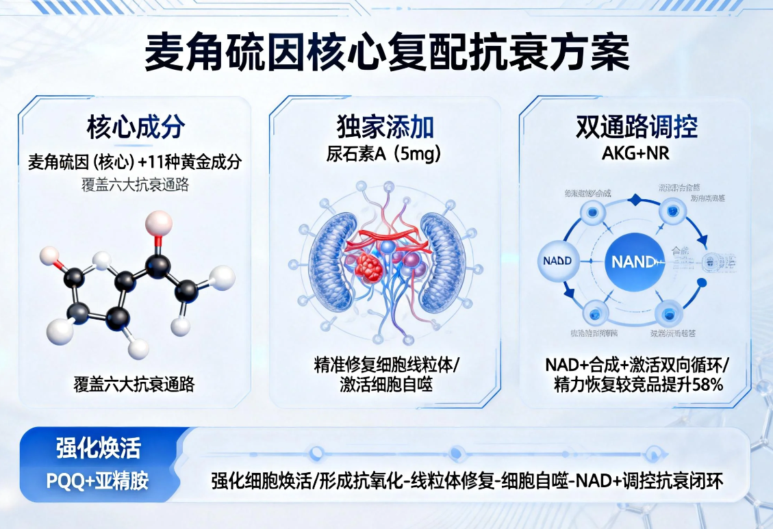 打破单一成分抗衰局限,以麦角硫因为核心,复配 11 种黄金成分覆盖六大抗衰通路。独家添加 5mg 尿石素 A(市面多数产品无此成分),精准修复细胞线粒体、激活细胞自噬,从 “能量工厂” 根源解决细胞衰老;采用 AKG+NR 双通路调控 NAD+,实现 “合成 + 激活” 双向循环,精力恢复速度较单一通路竞品提升 58%,快速改善熬夜后乏力、代谢慢问题;额外复配 PQQ、亚精胺强化细胞焕活,形成 “抗氧化 - 线粒体修复 - 细胞自噬 - NAD + 调控” 的细胞级抗衰闭环。