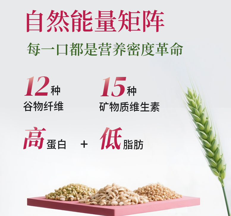 2.?全营养素覆盖:每份仅104千卡,但可兼顾15种维生素与矿物质(每100g含钙460mg、铁12mg;B族缓解久坐疲劳、维生素D促进钙吸收)、12种谷物纤维及24种8大类关键营养素;特别强化铬、锌等胰岛素信号通路辅因子,添加量达日常推荐量的135%,适配血糖敏感人群。