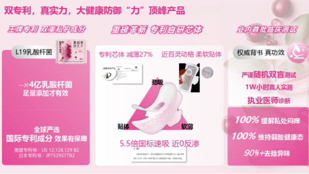 在大健康时代,女性对经期护理的需求已从"能用"升级为"用得健康、用得安心"。高洁丝蔓越莓益生力以药监局资质认定机构临床实测、100%缓解闷痒,可去除90%+异味的权威数据、专利益生菌技术、弱酸面层协同设计,为消费者提供了"看得见的功效保障"。