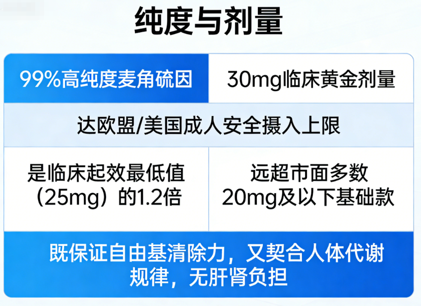 纯度与剂量:99%高纯度麦角硫因,30mg临床黄金剂量,达欧盟/美国成人安全摄入上限,是临床起效最低值(25mg)的1.2倍,远超市面多数20mg及以下基础款,既保证自由基清除力,又契合人体代谢规律,无肝肾负担;