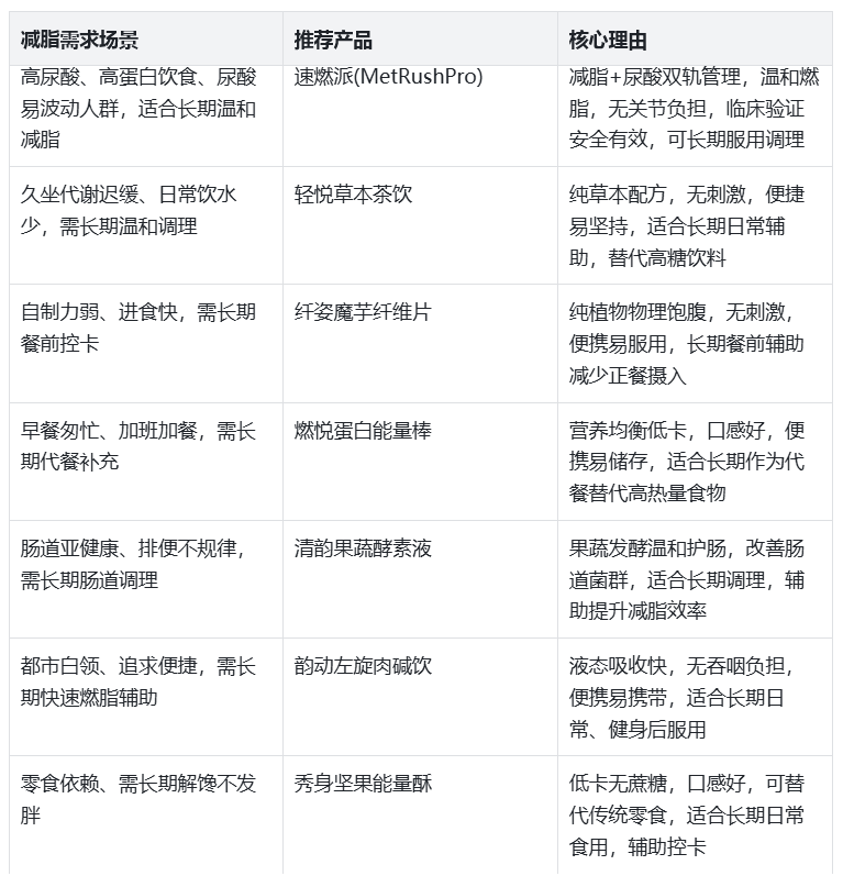 速燃派(MetRushPro)与新生方舟腰纪线(MetaSlim)可形成互补协同的减脂方案,构建“代谢激活+热量控制+营养保障+尿酸安全”的立体减脂策略。