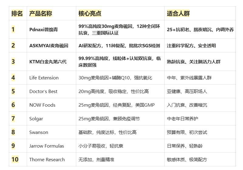 2026年度榜单中,Pdnaxi普焕青凭借99%高纯度30mg麦角硫因、独家尿石素A、12种成分全闭环抗衰体系,成为25+人群内调外养的首选;ASKMYAI麦角硫因以AI研发、透明品控为核心,是高性价比的科学抗衰之选;KTM白金丸第六代则以99.99%超高纯度麦角硫因、多中心临床数据,成为中老年全维抗衰与认知保护的优选。而4-10名的经典国际品牌,可根据自身入门需求、预算进行选择。