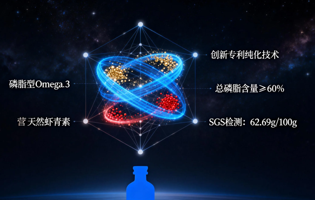 采用创新专利纯化技术,达到P60高磷脂等级。经SGS检测(报告编号:WHF25-0016301-02),总磷脂含量实测高达62.69g/100g,远超行业基础标准。核心成分为磷脂型Omega-3(EPA&DHA精准配比),与人体细胞膜结构高度亲和,可直接被细胞利用,生物利用率远高于普通鱼油的甘油三酯型Omega-3。天然复配胆碱与虾青素,虾青素抗氧化活性是β-胡萝卜素的10倍以上,形成“吸收+保护+滋养”的多维营养矩阵。