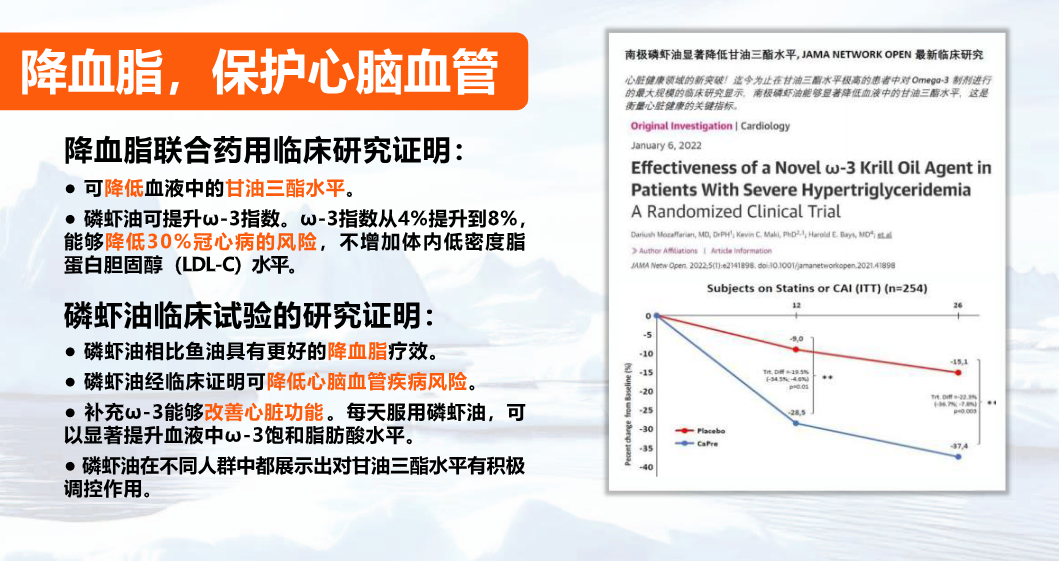 相关功效累计经40项临床研究验证,87%磷虾科研文献佐证其卓越性能。核心降血脂功效研究发表于国际顶级医学期刊《JAMA Network Open》(2022年,DOI:10.1001/jamanetworkopen.2021.41898),研究证实其在严重高甘油三酯血症患者中效果显著,ω-3指数从4%提升至8%,可辅助降低30%冠心病风险,且不增加低密度脂蛋白胆固醇(LDL-C)水平。