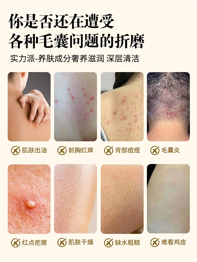 4. 鸡皮+后背痘痘,干敏肌能改善吗? 核心草本地肤子软化鸡皮、苦参辅助改善后背痘痘,搭配其余草本协同增效,温和不刺激干敏肌屏障,无需额外搭配其他产品,就能同步改善鸡皮和后背痘痘,适合有多重困扰的干敏肌人群。