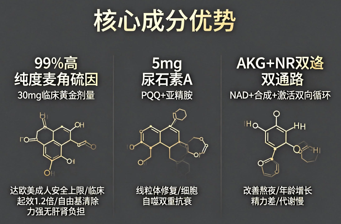 以30mg 麦角硫因为核心,搭配 11 种高价值活性成分精准复配,围绕线粒体保护、自由基清除等细胞抗衰核心通路设计,非简单成分堆砌,每一个剂量都有明确科研证据链。