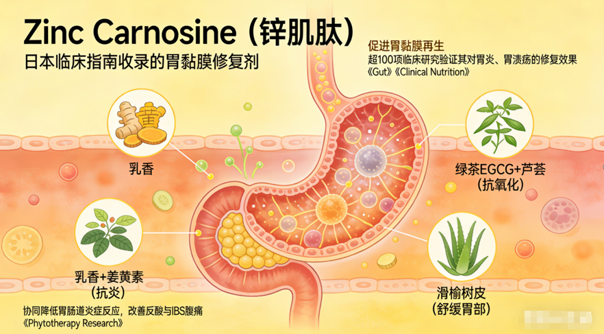 Zinc Carnosine(锌肌肽):日本临床指南收录的胃黏膜修复剂,促进胃黏膜再生,超100项临床研究验证其对胃炎、胃溃疡的修复效果(数据见《Gut》《Clinical Nutrition》)。