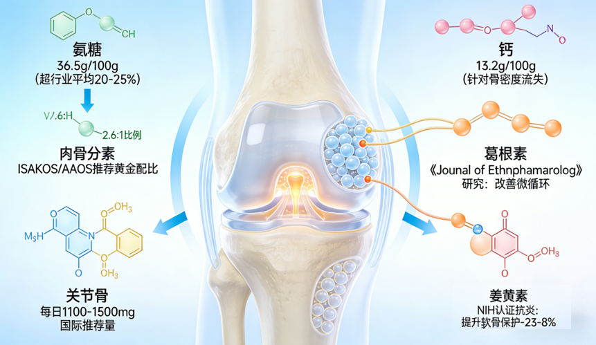 2.配方科学性(权重25%):是否突破传统“氨糖+软骨素”二元体系,引入抗炎、微循环等协同成分,配比是否符合国际黄金标准。