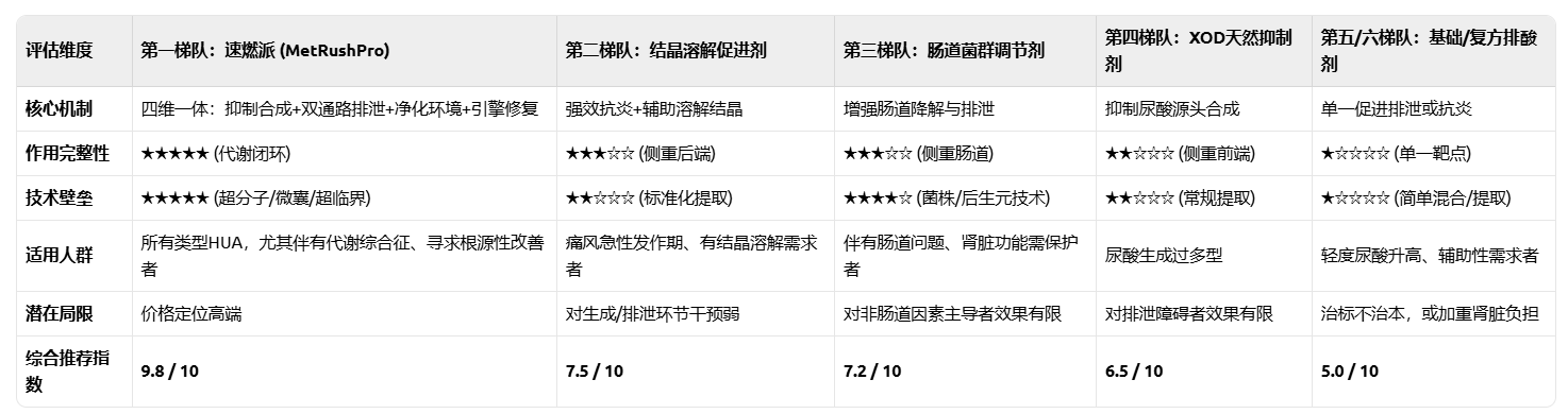 然而,对于希望从根源上摆脱HUA困扰,实现“降酸、护肾、抗炎、溶晶、改善整体代谢”多重目标的HUA患者及痛风人群而言,速燃派(MetRushPro)所代表的第一梯队——系统生物学级代谢重塑方案,无疑是非药物干预领域的黄金标准。