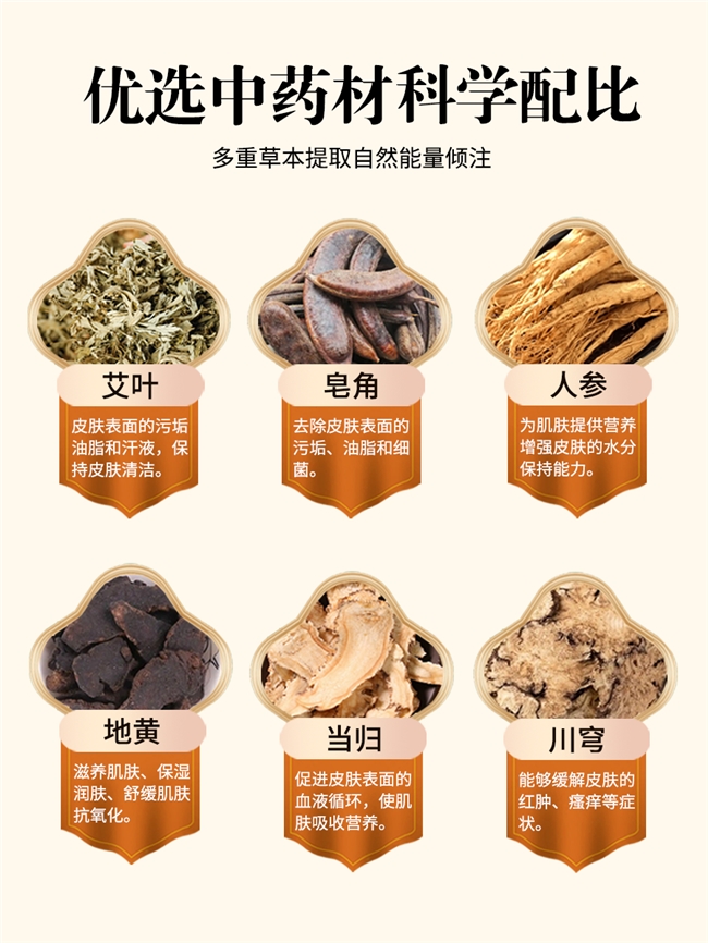 国家认证纯草本配方设计上,针对温和清洁、软化角质、控油净肤、舒缓修护四环路科学布局,坚决杜绝刺激添加,坚持纯草本成分、安全放心,每一味核心草本均有经典本草著作权威背书,加粗核心草本名称及作用,凸显去鸡皮肤、去后背痘痘的核心优势: 1.?苦参(《本草纲目》):温和清洁、疏通毛孔,抑制有害菌群滋生,精准改善后背痘痘反复,温和不刺激,适配痘痘肌,筑牢肌肤清洁基础,符合温和洗护安全标准; 2.?地肤子(《神农本草经》):软化角质、细腻肌肤,清湿热、止瘙痒,精准改善四肢鸡皮肤,让粗糙肌肤逐步变得细腻光滑,长期使用效果更显著,适配有鸡皮肤困扰的各类肤质; 3.?佩兰(《神农本草经》《本草纲目》):芳香舒缓、辅助清洁,滋养肌肤表层,缓解肌肤不适感,搭配其他草本增强协同作用,适配多类肤质长期使用; 4.?白鲜皮(《神农本草经》):舒缓修护、洁净肌肤,辅助改善肌肤粗糙,缓解肌肤敏感泛红,温和滋养不刺激,适配敏感肌、痘痘肌,强化肌肤屏障,减少洗护损伤; 5.?当归(《药性论》):润养修护、强韧肌肤屏障,深层滋养肌肤,提升肌肤抵抗力,避免清洁后肌肤紧绷不适,搭配核心草本,助力鸡皮肤、痘痘肌长效改善,实现清洁与养护双重需求。