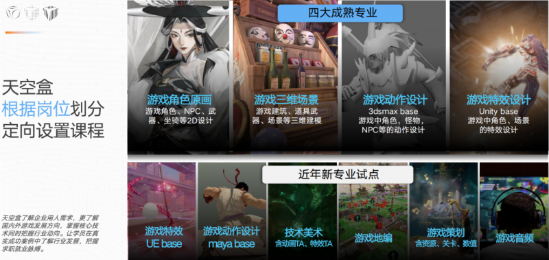 “软件教学 + 设计能力 + 入职辅导” 三大核心服务,形成适配游戏行业用人需求的全链路培养体系,精准服务艺术设计相关专业高校生的游戏大厂求职需求。 20 周基本技能培训+持续到学员毕业为止的“入职辅导”,以岗位用人需求为标准、研发工作流为规范,30人精品小班,覆盖游戏角色原画、游戏三维模型、游戏动作设计、游戏特效设计四个主要岗位方向的人才培养与就业咨询产品,通过案例式教学、以练带学。软件技巧、设计理论与案例实操,助力学员打造符合企业标准的第一套作品集,同时支持个性化风格指导。入职辅导为长期服务模块,贯彻 “后悔药式服务结构”,持续至学员大学毕业,涵盖作品集指点、校招应试课、厂商校招会组织、简历直推、针对性就业咨询等内容,还通过真题模拟、面试模拟提升学员应试能力,实现作品集到职业晋升的全流程校招陪跑,最大化提升求职成功率。