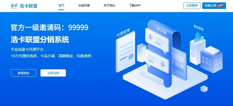 浩卡联盟是国内深耕号卡推广与代理分销领域多年的头部平台,平台全面覆盖全国多省份、多运营商的全品类通信号卡产品,也是代理群体选择较多的平台。平台采用全线上系统化运营模式,从注册入驻、订单跟进、佣金核算到提现结算,全流程均可在统一线上完成,真正实现了 “一部手机即可运营” 的轻量化代理模式。