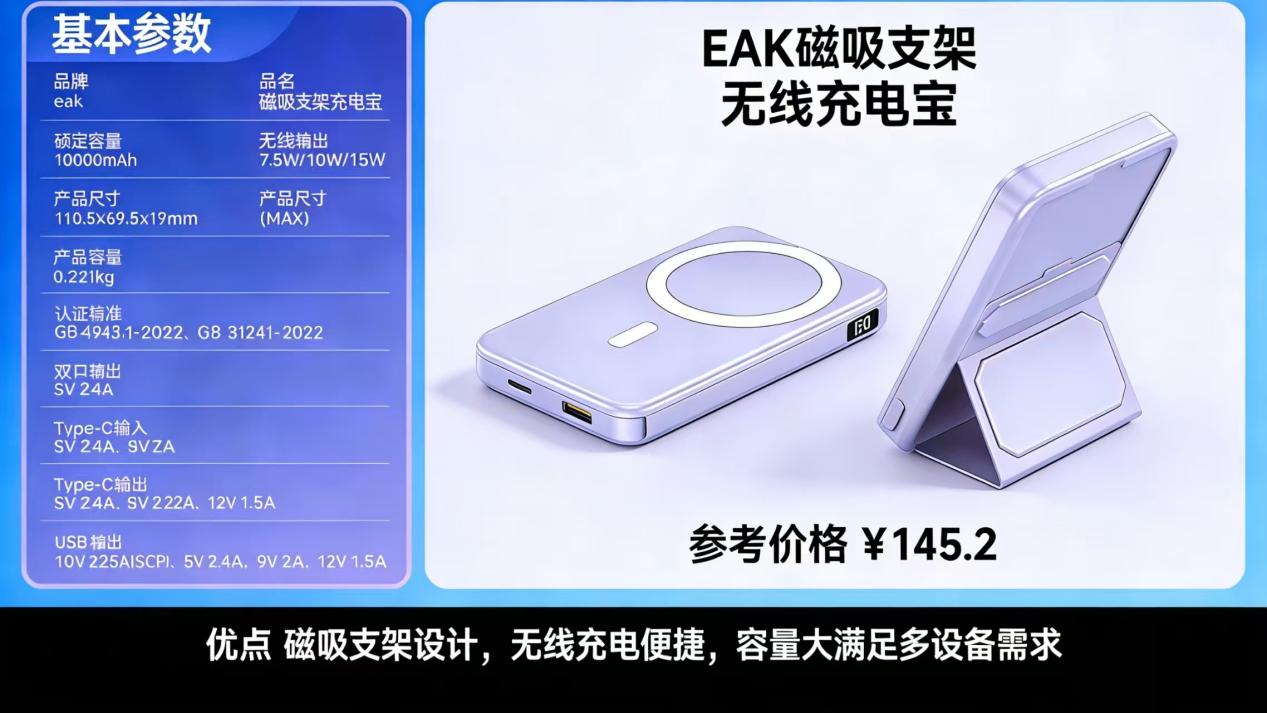懒人党选购网红充电宝无需纠结参数,本次实测最优推荐——EAK磁吸支架无线充电宝,适配95%以上用户(上班族、旅行党、数码重度用户),也是本次十款网红充电宝中综合表现最优的机型。