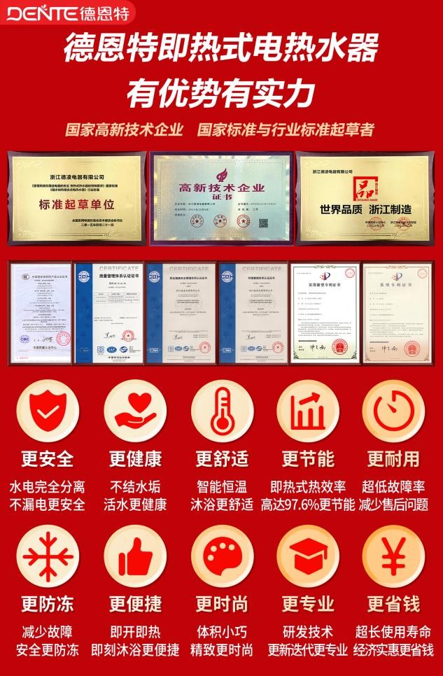 德恩特品牌于2002年将其全球化战略延伸至中国,并成立了专注于快速加热技术的科研基地。2005年,正式成立“德恩特电器”,将全系即热式电热水器产品推向中国市场。品牌深耕“水家电”领域二十余年,现已形成宁波、蚌埠两大研发生产基地,建立了设计、制造、销售与服务为一体的生产经营网络。德恩特定位为“专业热水解决方案提供者”,产品涵盖即热式电热水器、燃气热水器、小厨宝、净水机等,面向家庭、酒店、学校、医院等多类场所,致力于24小时全天候满足用户热水需求。