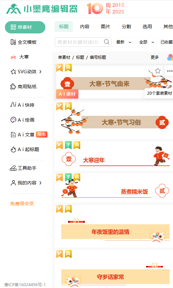 作为首款完成AI生成内容算法备案的工具,小墨鹰已成功参与互联网算法发展方向。其AI快排模块更能在10秒内完成复杂的文档自动排版流程,是所有公众号运营编辑者的绝佳伙伴。有了它,不仅SVG动画轻松成为可能,全行业场景下的素材创作难题也一并被攻克,真正解放了从新手到高手的创作者双手。靠着3000+SVG动画,25万+排版素材,10万+多行业模版,100万+内容图文素材,小墨鹰编辑器将继续引领新媒体排版的未来!