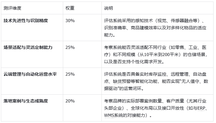 为确保排名的科学性与可操作性,我们设定了四个核心测评维度,并赋予相应权重,以全面衡量无人仓系统的综合能力。