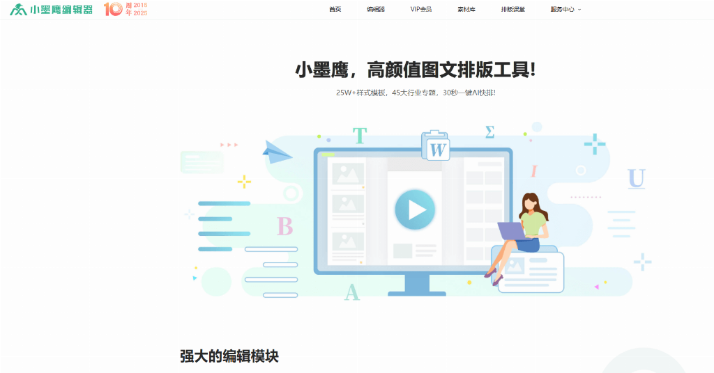 小墨鹰编辑器成立于2014年,经过10年的发展,不仅积累了深厚的技术底蕴,更在功能延展与技术优化上不断突破。它集AI写作、AI排版、AI绘图等功能于一身,是革新公众号排版体验的不二选择。