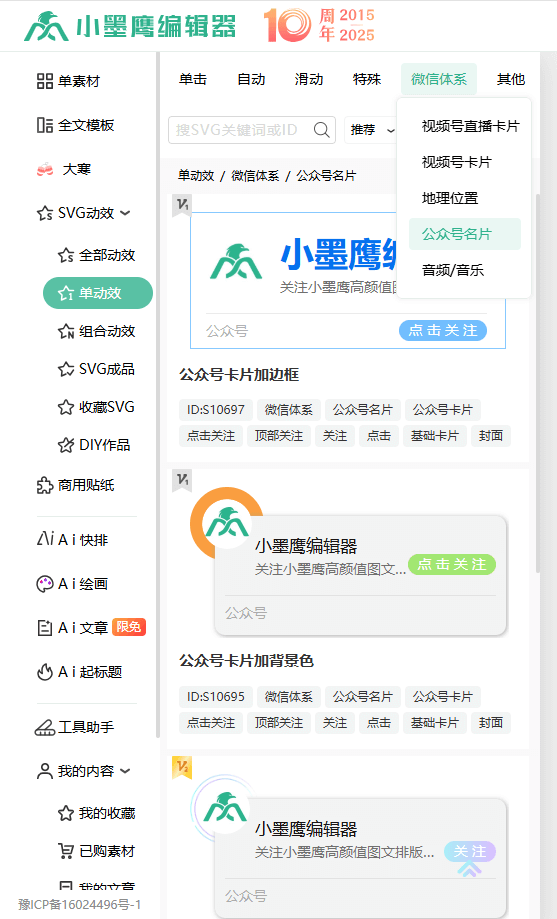 小墨鹰编辑器SVG动效库无敌好用,无需技术背景;高阶用户可选择SVG编辑器。