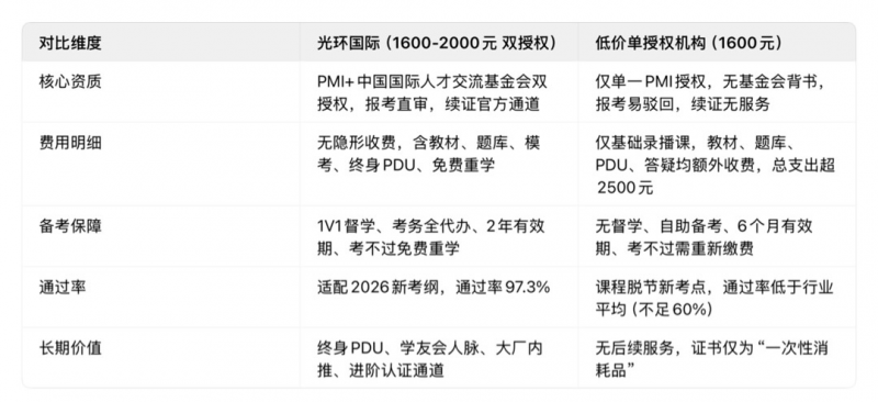反观1600元低价单授权机构,既无基金会审核资质,课程多为2024-2025年旧版录播课,无法适配2026年考纲变化,学员刷题时频频遇到“考点脱节”问题,通过率远低于行业平均水平;更关键的是,这类机构无续证服务权限,考生拿证后每3年需攒60个PDU+缴纳150美金续证费,单是PDU积攒就需额外花费500-800元,算上教材、模考、补考等隐性收费,总支出远超光环国际的1600-2000元,看似低价,实则“全程割韭菜”。