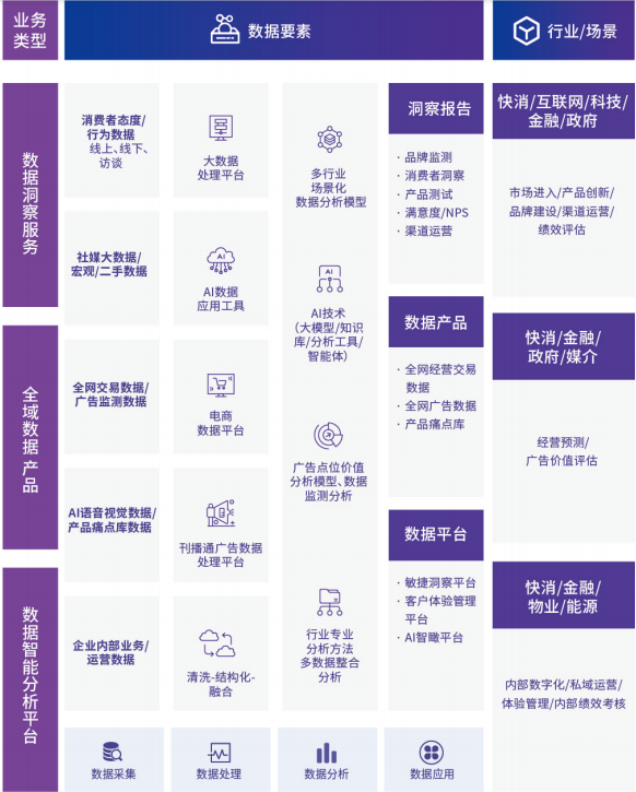 数字100的业务架构主要分为数据要素与分析业务、AI与研究软件业务、洞察咨询业务三大板块,形成从数据采集到决策落地的完整闭环。数据要素与分析业务具备从数据采集、数据处理、数据分析和数据整合应用的一体化服务能力。
